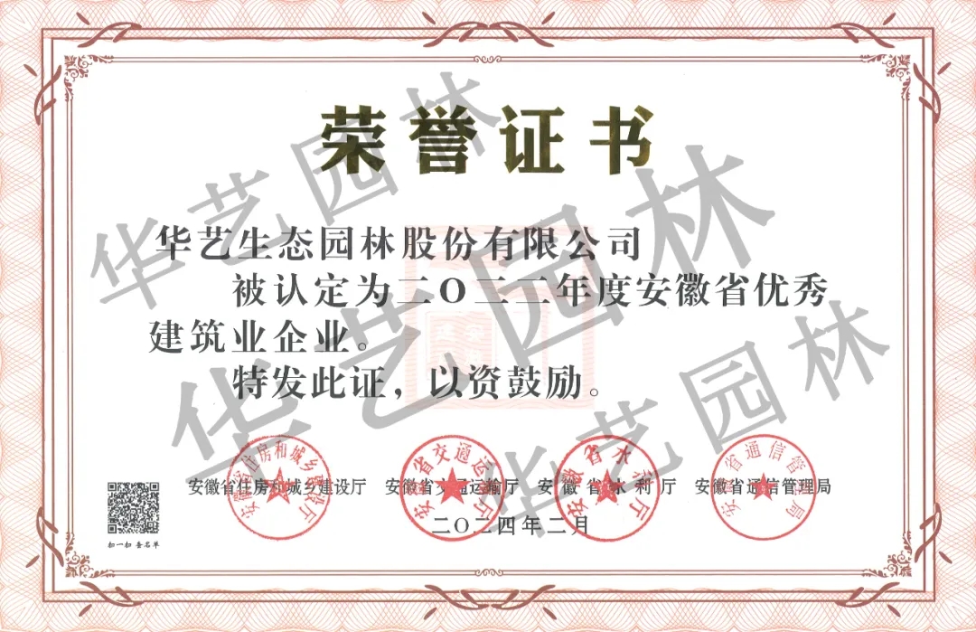 近日,安徽省住房城乡建设厅召开全省建筑业发展工作推进会,会议通报表扬了“2022年度安徽省建筑业龙头骨干企业”,并公布了“2022年度安徽省优秀建筑业企业”名单。华艺园林凭借强劲的综合实力、创新管理、智慧转型、品牌影响力,连续三年荣获“安徽省优秀建筑业企业”,并首次被授予“安徽省建筑业骨干企业”荣誉称号。