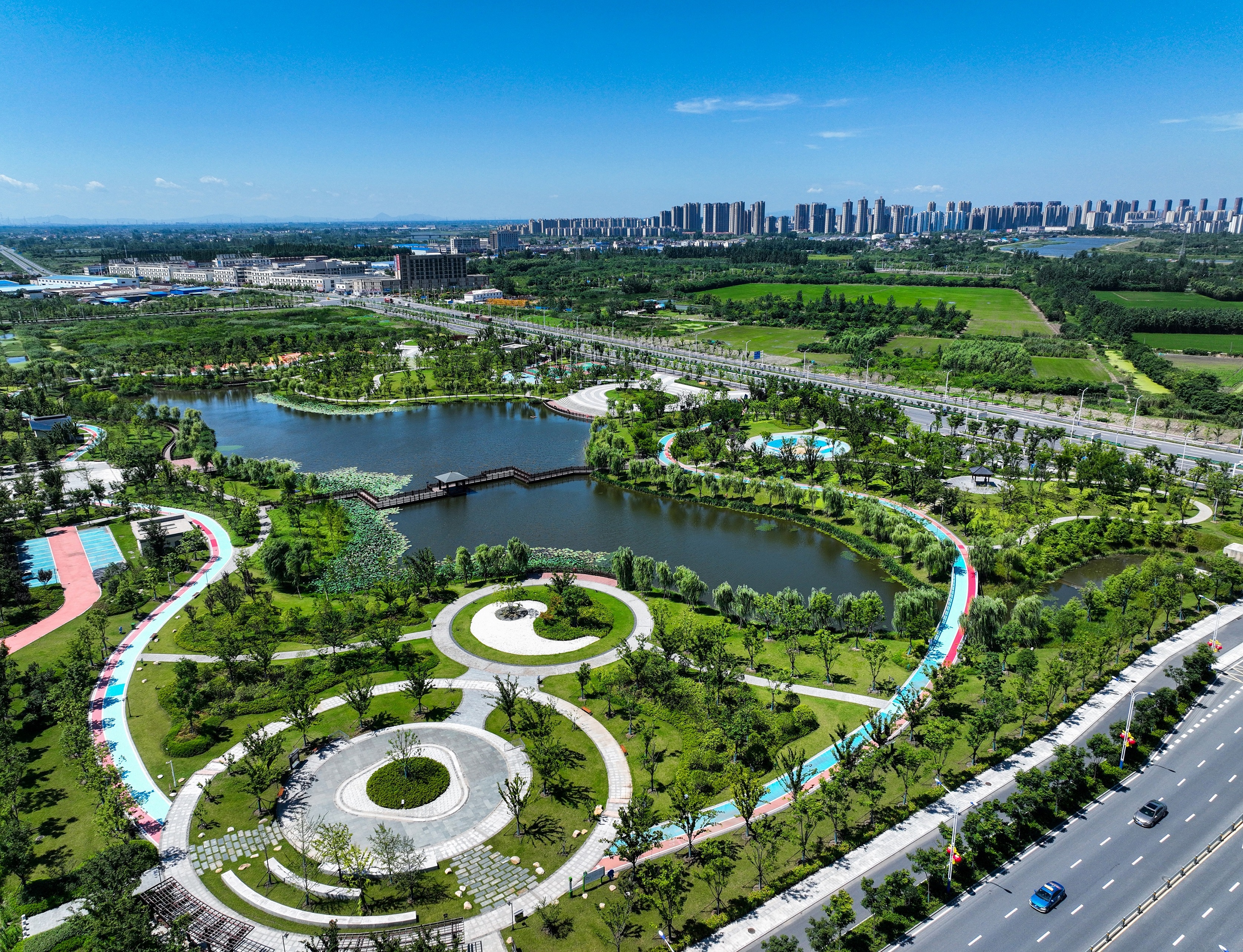 无为市东部新城基础设施及配套建设项目(一期)站前公园及广场项目位于无为市福渡镇福贸路与S208交叉口东南侧,包含无为站前广场和站前公园两部分,其中站前广场面积约为19965平方米,绿化率约43%,主要建设内容包括活动草坪、铺装、锥坡绿化、组雕等景观工程,电气工程和给排水工程;站前公园面积约105054㎡,绿地率约79%,其中水体面积约为32928㎡,主要建设内容包括铺装工程、景观、景观桥、箱涵、溢流堰、绿化工程、给排水系统、灌溉系统、木栈道及景观平台、景观照明、公厕。根据“山环西北,水聚东南”的设计理念,形成“一轴、两片、一环、多节点”的景观布局,打造具有地域特色及景观艺术形式的城市站前广场。建成后将成为无为市的新名片,一个具有现代都市气息的新地标,全方位展示了无为城市的崭新形象。