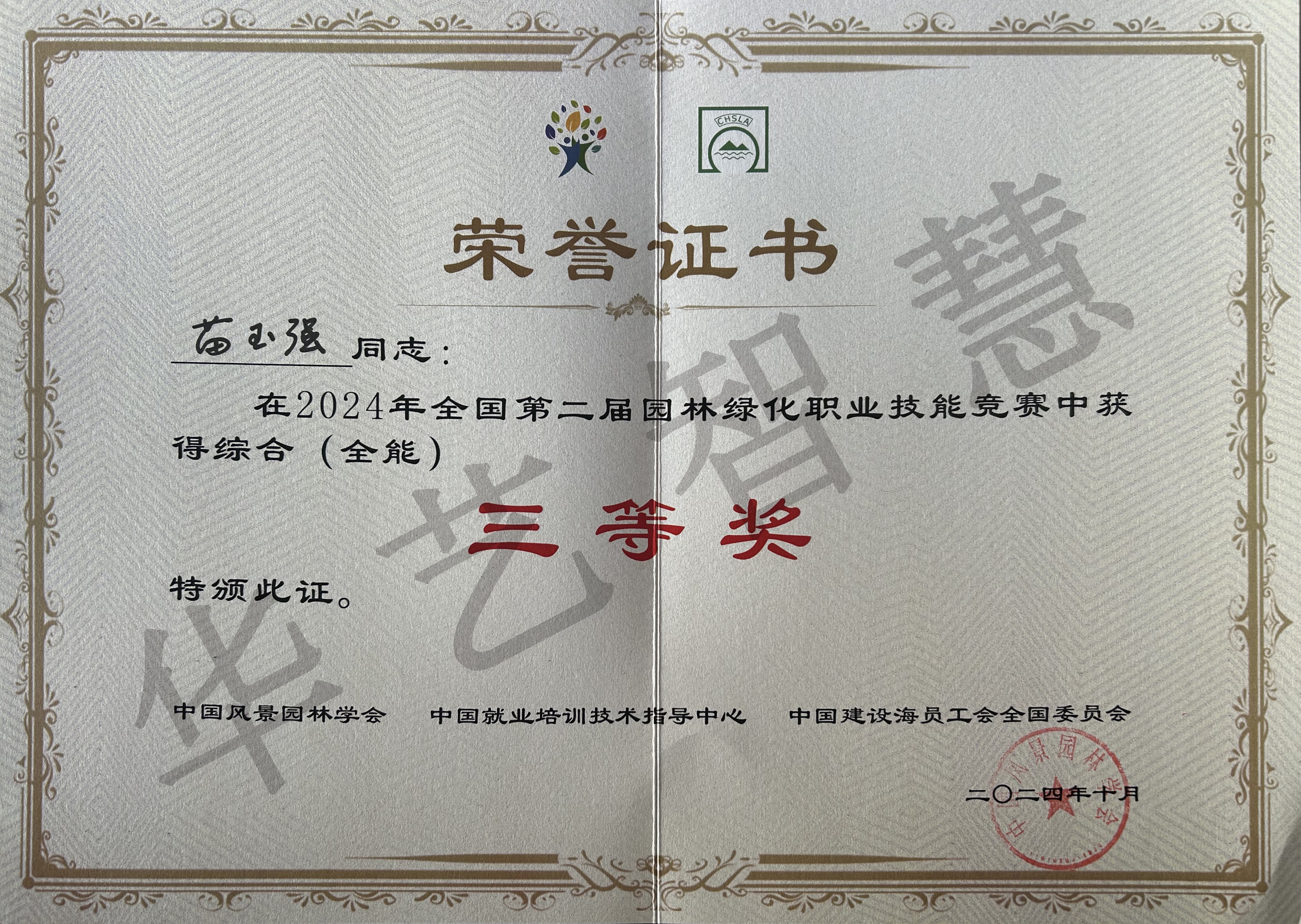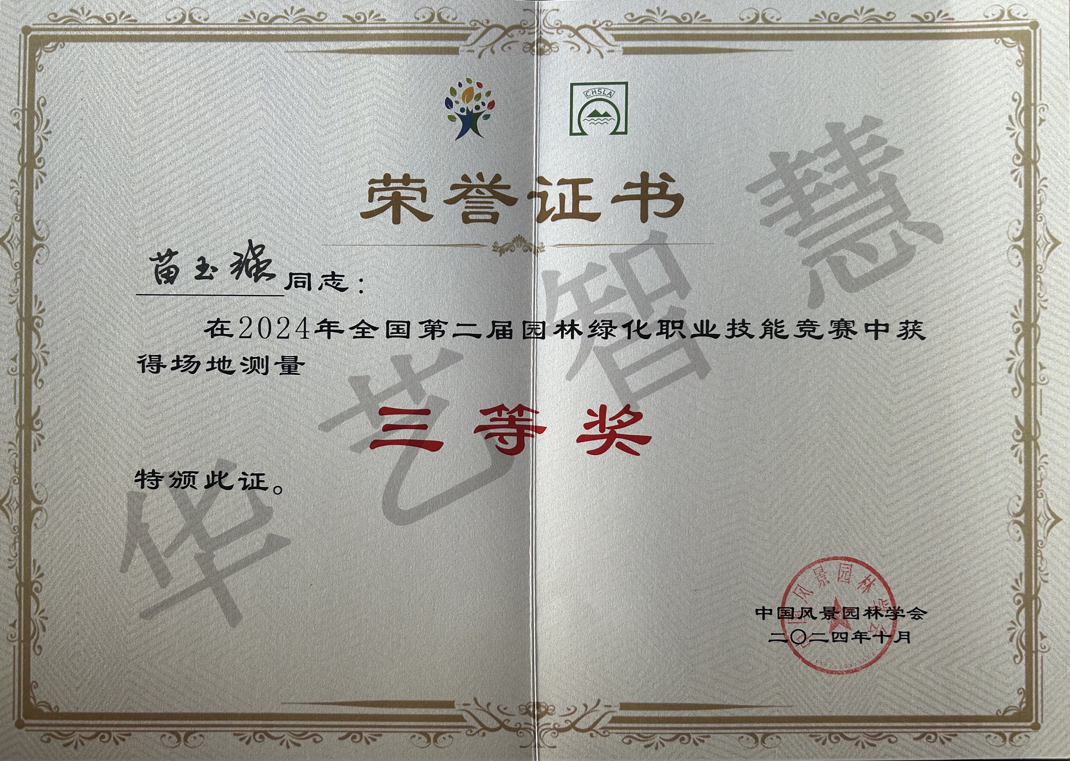 2024年10月25—28日,由中国风景园林学会、中国就业培训技术指导中心和中国海员建设工会全国委员会联合主办的“2024年全国第二届园林绿化职业技能竞赛”在北京隆重举行。华艺智慧科技股份有限公司工程师苗玉强凭借扎实的专业知识、精湛的技艺和卓越的团队协作精神,从众多选手中脱颖而出,荣获综合(全能)三等奖、场地测量三等奖。
