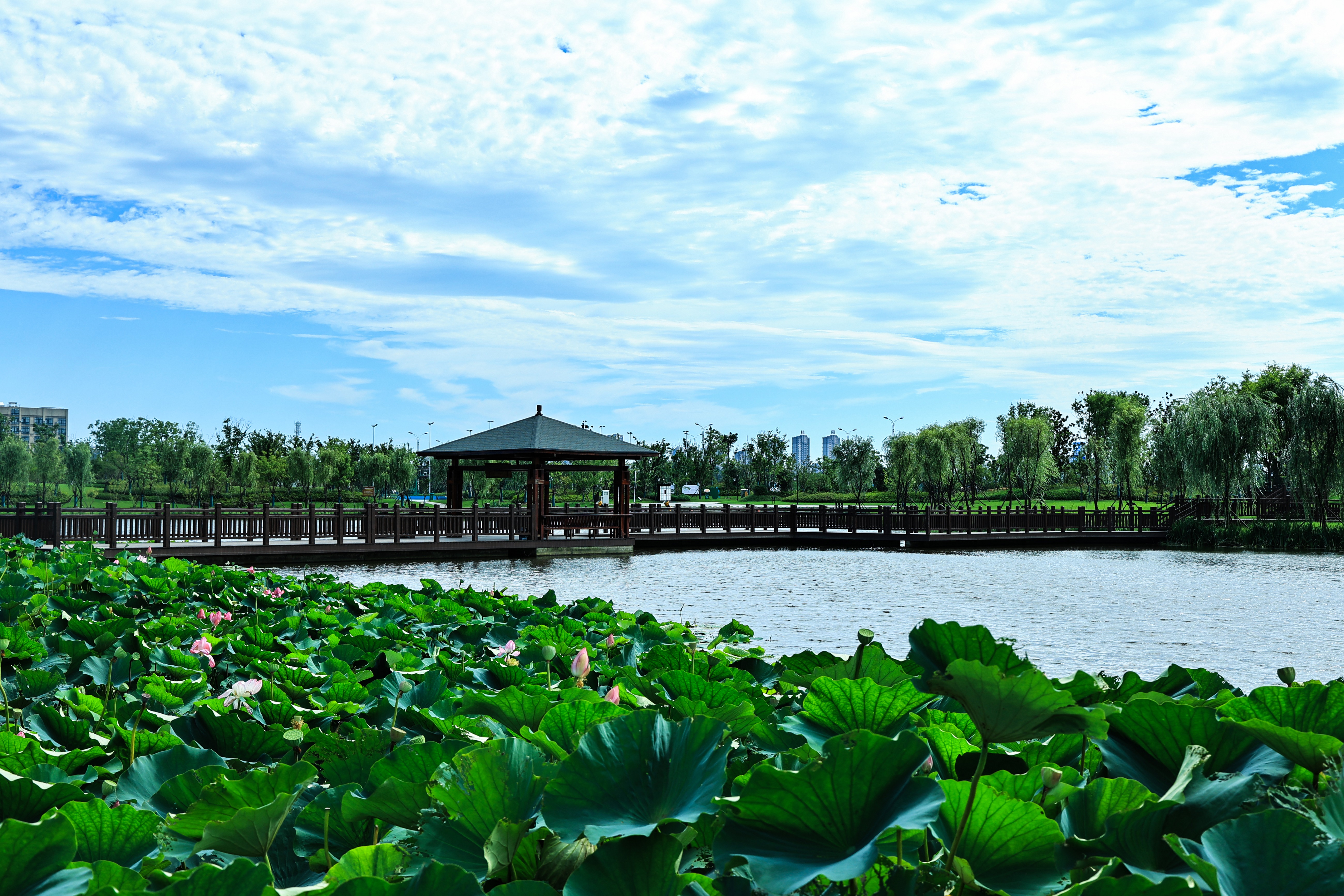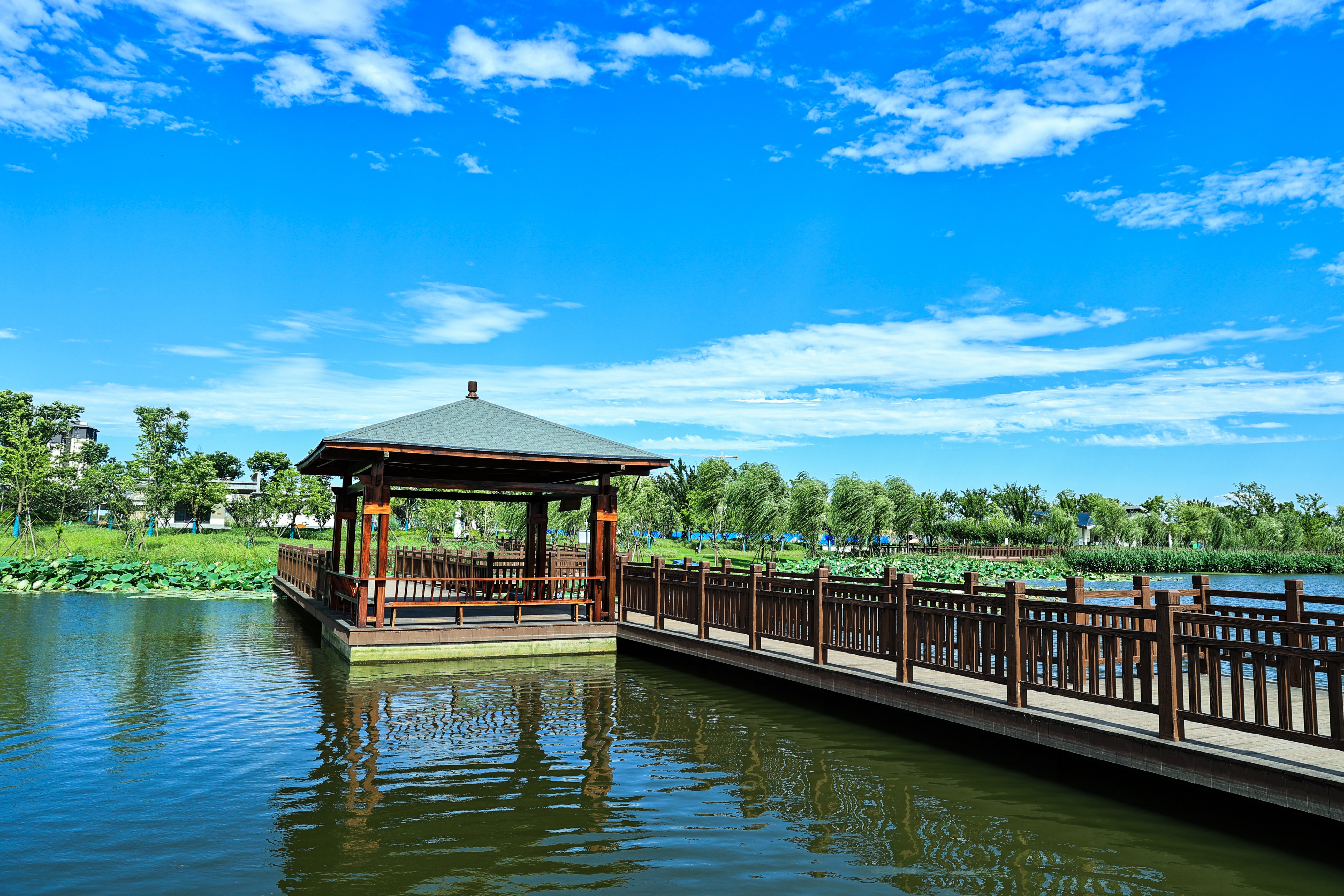 西拥青山,东怀绿水。一个会呼吸的生态湖泊内,蜿蜒栈道、四方景亭、飞虹彩桥对水面进行有机分割,形成错落有致的湿地景观空间,游客穿行而入,来一场关于水生态、水文化、水景观的对话之旅。