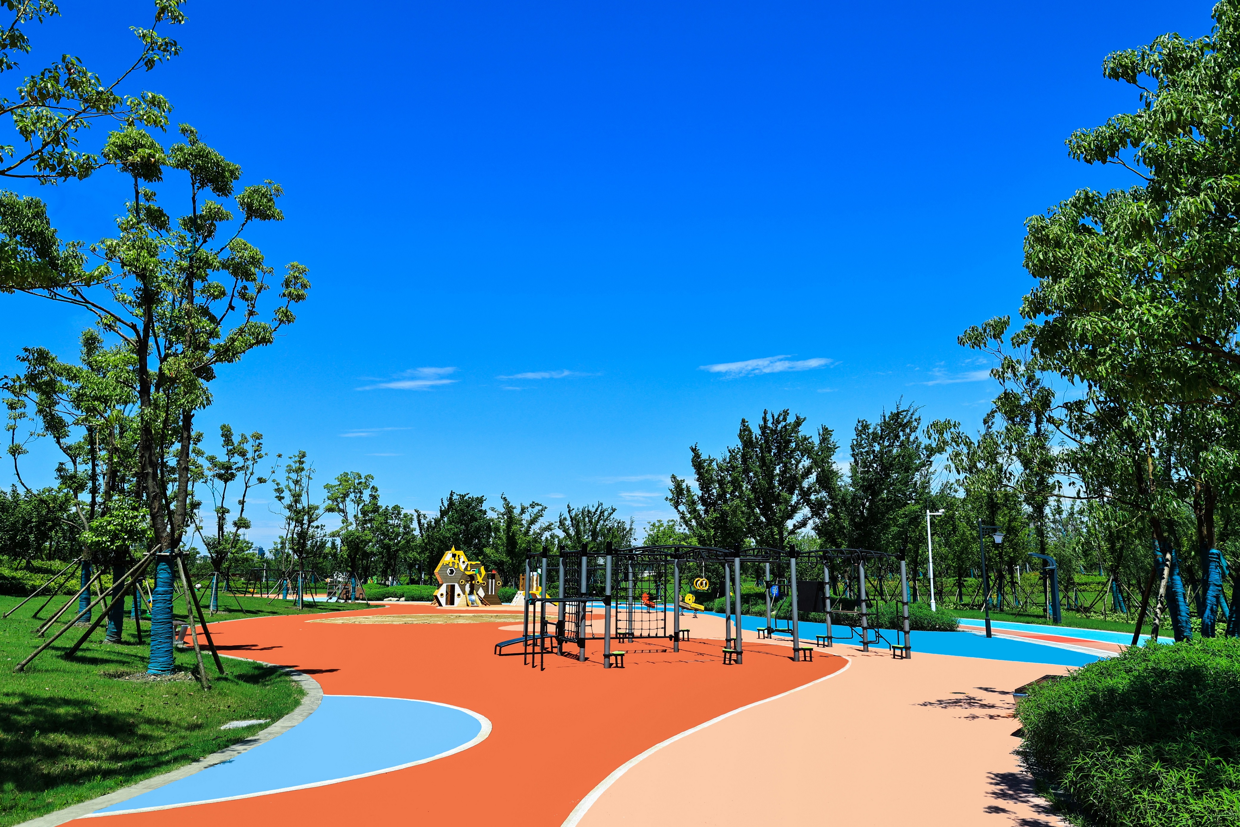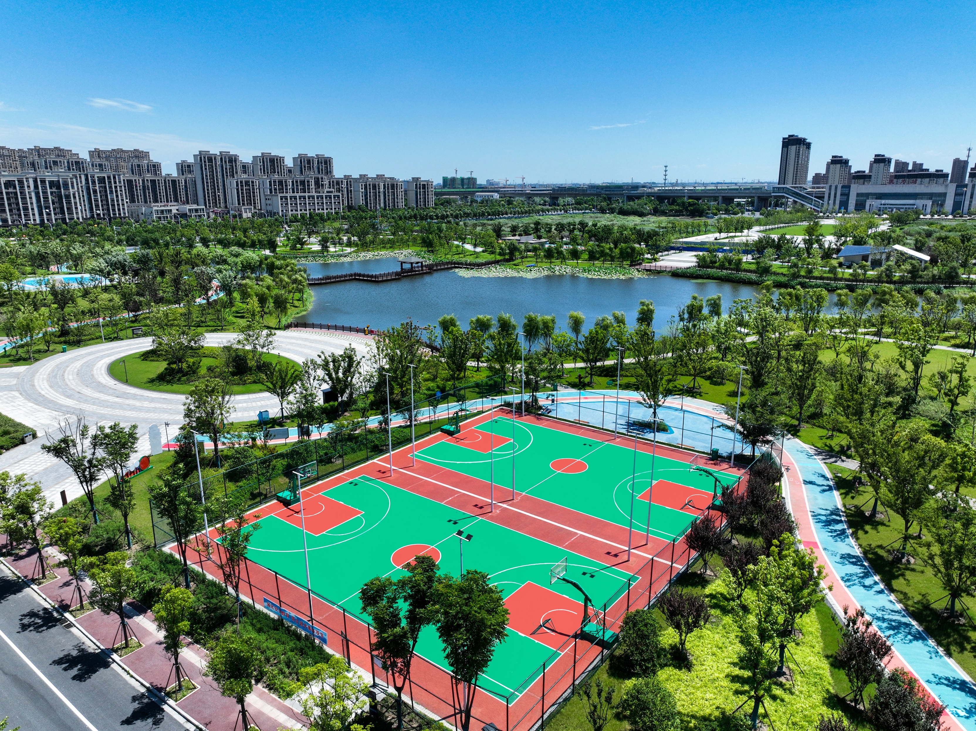 以健康跑道为纽带,篮球场、儿童游乐场等互相连接,休闲座椅、沙池、滑梯点缀其中,为青少年、儿童、老年人提供了多功能综合健身、游憩乐园,重塑了健康生活方式。