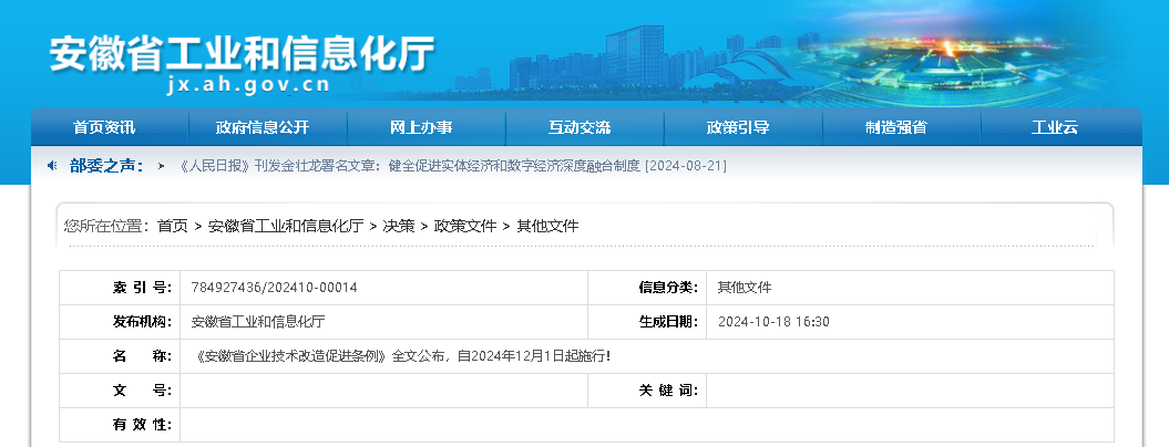 《安徽省企业技术改造促进条例》已经2024年9月29日安徽省第十四届人民代表大会常务委员会第十一次会议通过,现予公布,自2024年12月1日起施行。