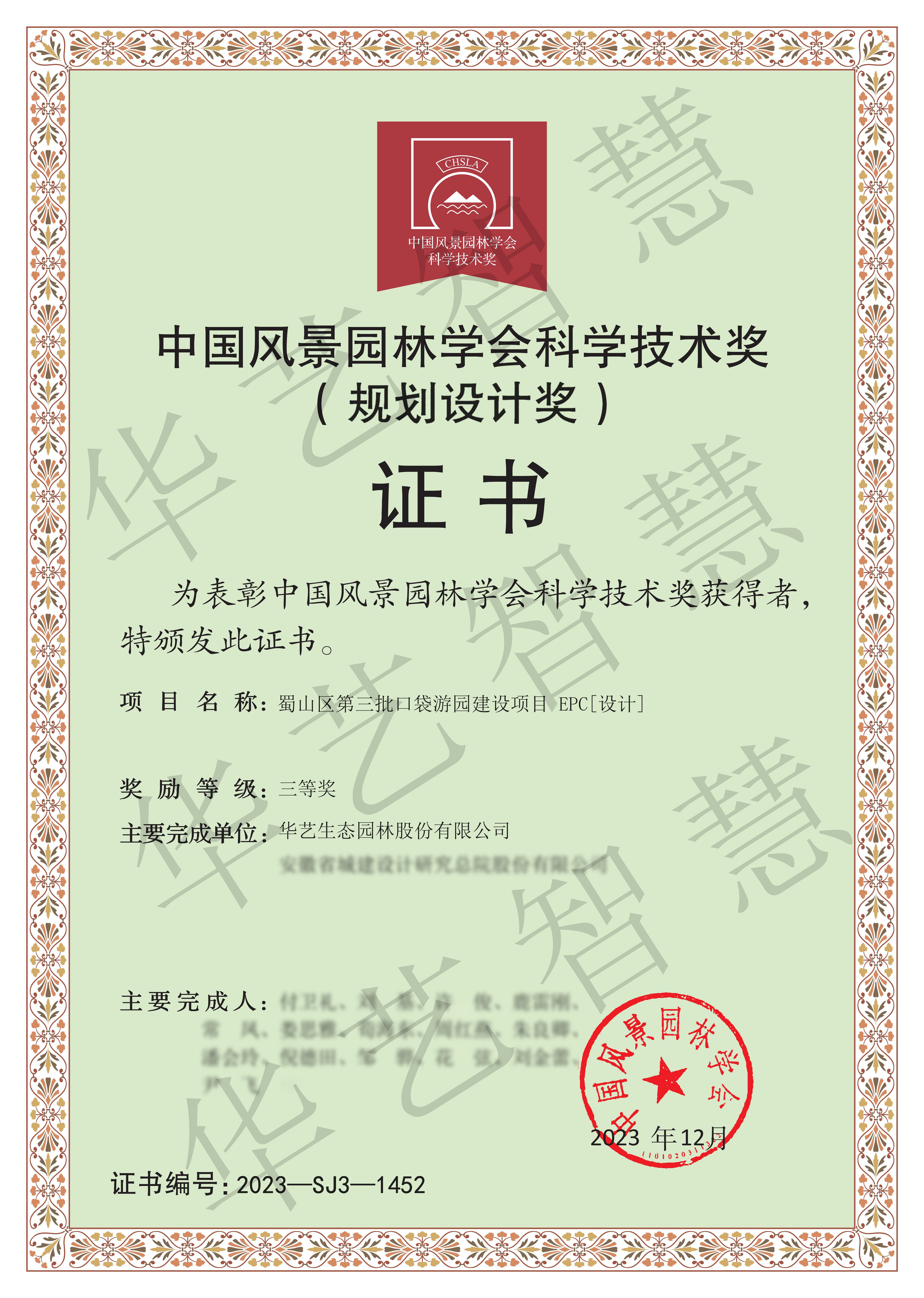 在中国风景园林学会科学技术奖颁奖典礼上,华艺智慧凭借富有艺术化原创优秀设计、低碳环保绿色化、集约管养智慧化的诗情画意产品,荣获(园林工程奖)铜奖1项、(规划设计奖)三等奖1项,其中铜奖为乐清市东运河公园建设工程一期,三等奖为蜀山区第三批口袋游园建设项目EPC[设计]。此次获奖,是乐清市东运河公园建设工程一期继荣获浙江省风景园林学会优秀园林工程奖(施工)金奖、温州市“优秀园林工程”金奖和蜀山区第三批口袋游园建设项目EPC[设计]继荣获安徽省市政工程优质奖、安徽省风景园林规划设计“园林杯”奖二等奖、合肥市“广玉兰杯”奖、合肥市市政工程“庐州杯”奖、合肥市优良园林工程奖之后的又一重大荣誉。