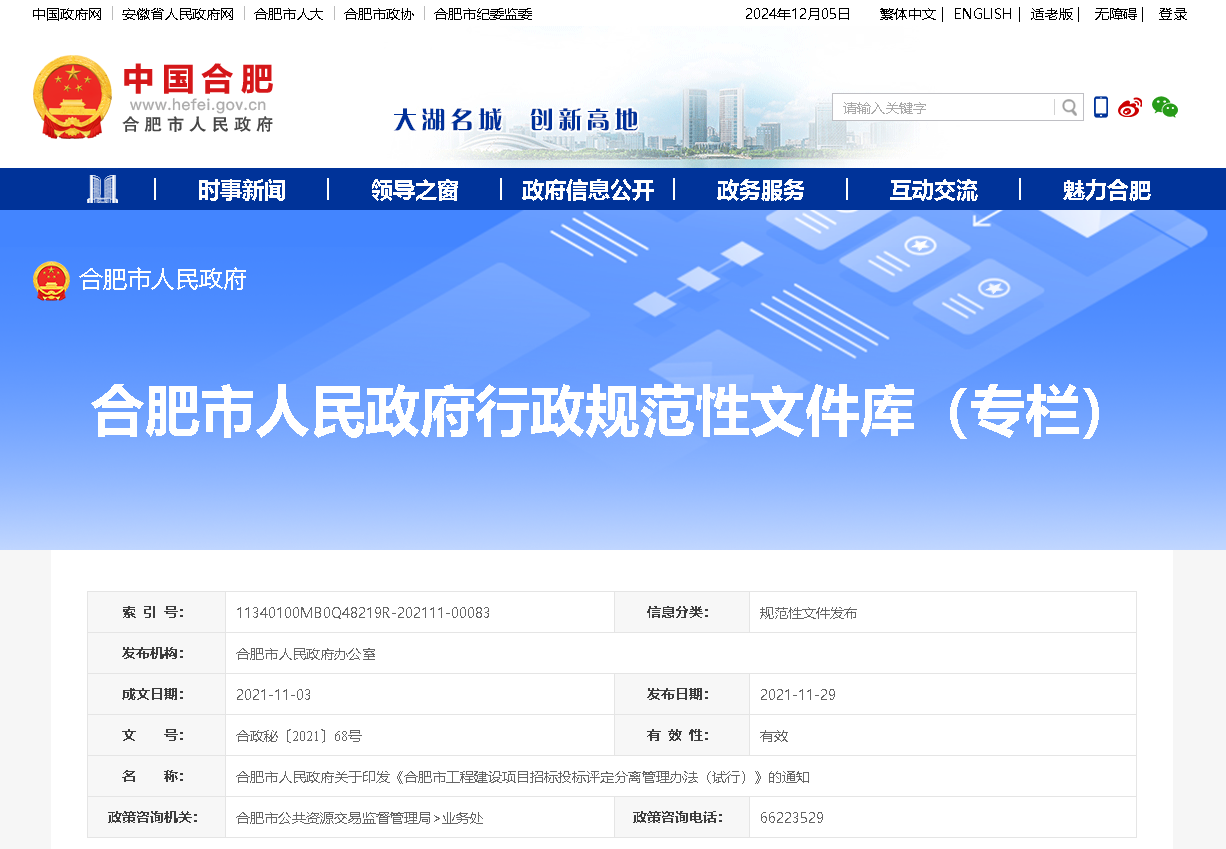 合肥市人民政府关于印发《合肥市工程建设项目招标投标评定分离管理办法(试行)》的通知