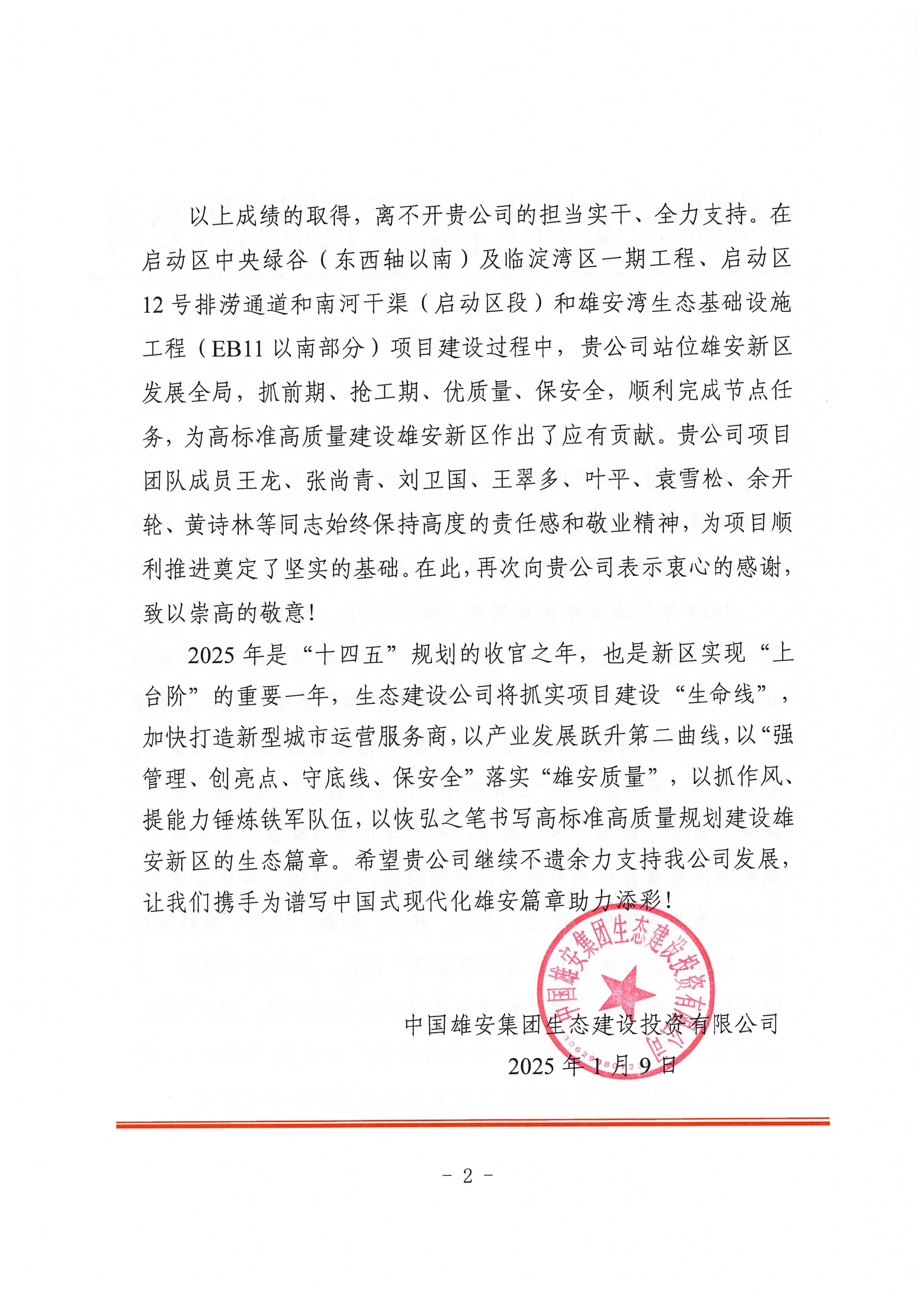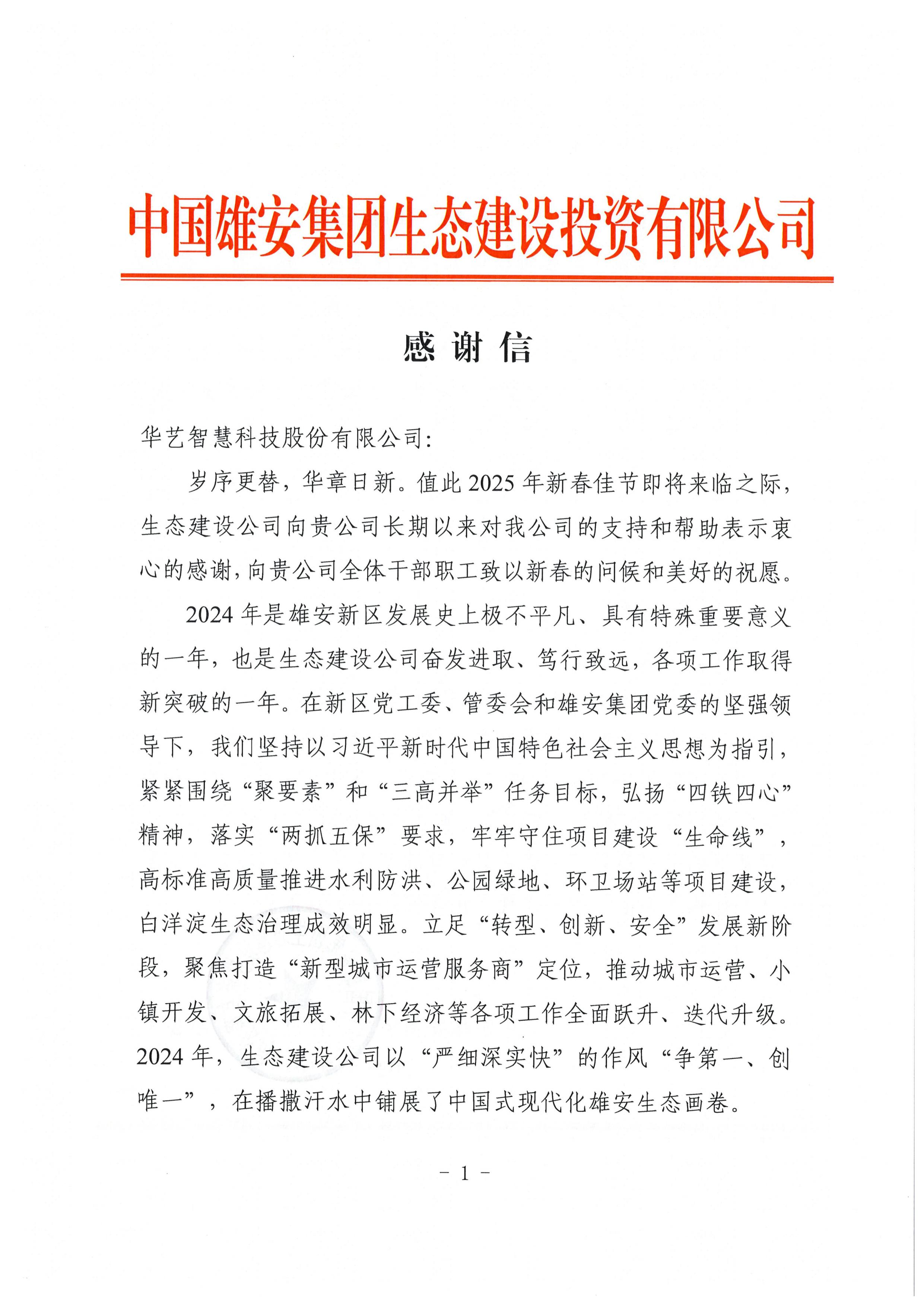 近日,华艺智慧科技股份有限公司收到来自中国雄安集团生态建设投资有限公司发来的一封感谢信,信中对华艺智慧在启动区中央绿谷(东西轴以南)及临淀湾区一期工程、启动区12号排涝通道和南河千渠(启动区段)和雄安湾生态基础设施工程(EB11以南部分)项目营造中“强管理、创亮点、守底线、保安全”落实“雄安质量”工作给予了高度评价,并对今后持续合作充满信心和期待。