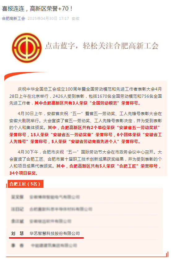 下午,合肥市举行庆祝“五一”国际劳动节大会,会上宣读了合肥工匠、合肥市第十届职工技术创新成果的通报,华艺智慧科技股份有限公司研发总监刘慧荣获“合肥工匠”荣誉称号。