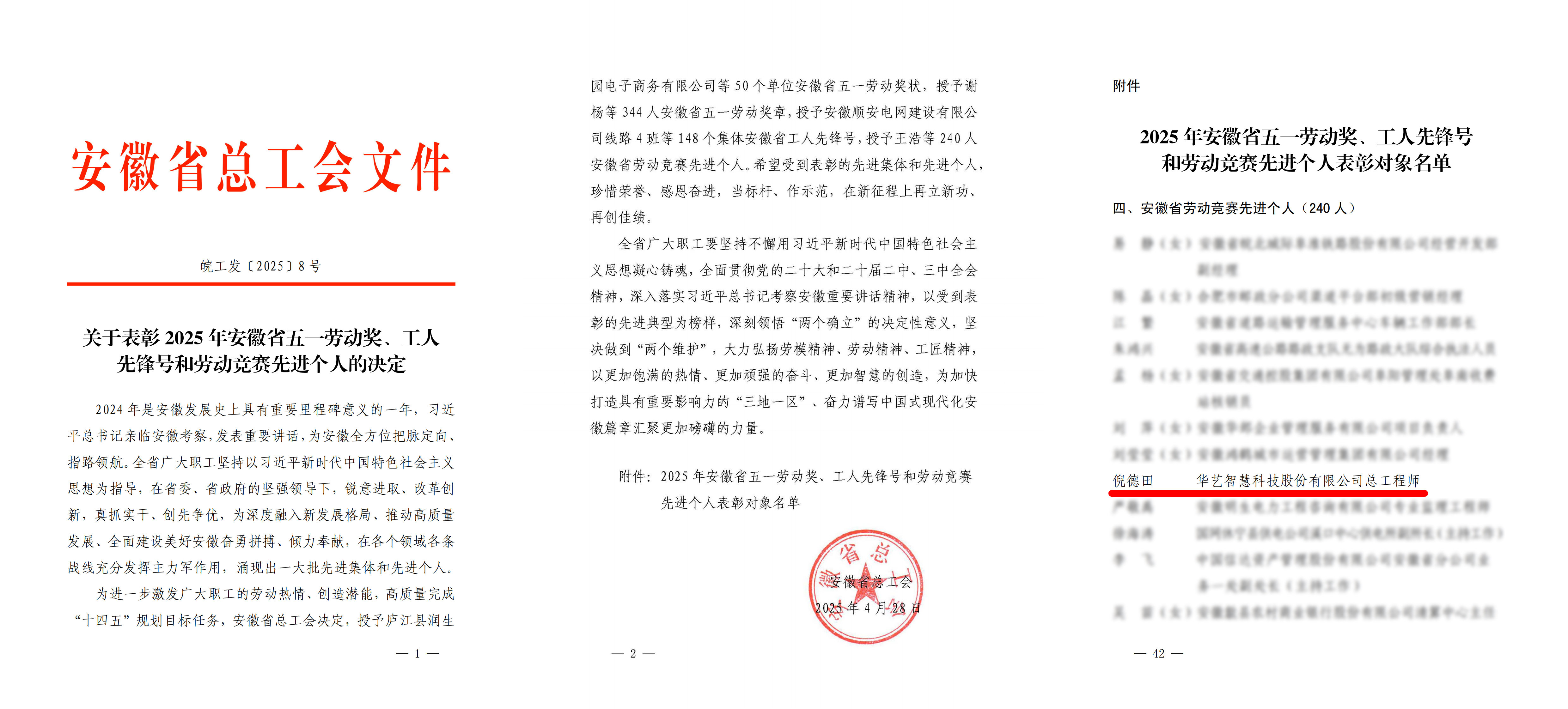 4月30日上午,安徽省庆祝“五一”暨省五一劳动奖、工人先锋号表彰大会在合肥隆重举行,会上宣读了《关于表彰2025年安徽省五一劳动奖、工人先锋号和劳动竞赛先进个人的决定》,华艺智慧科技股份有限公司总工程师倪德田荣获“安徽省劳动竞赛先进个人”荣誉称号。