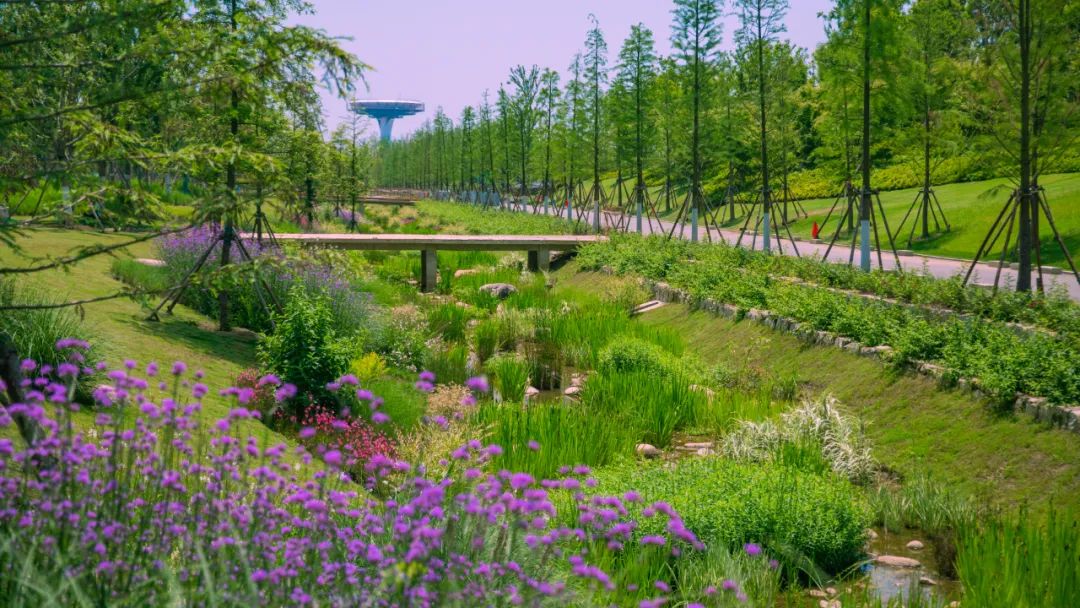 一条生态花溪为景观形式的大型植草沟贯穿整个区域,成为一道靓丽的风景线。通过大型植草沟、溪道、雨水花园联通水系,结合海绵城市理念,选用合适的植物进行搭配,实现排水、净化、沉淀等功能,形成长效性的海绵景观,塑造出具有水文化、水景观、水安全的水生态体系。
