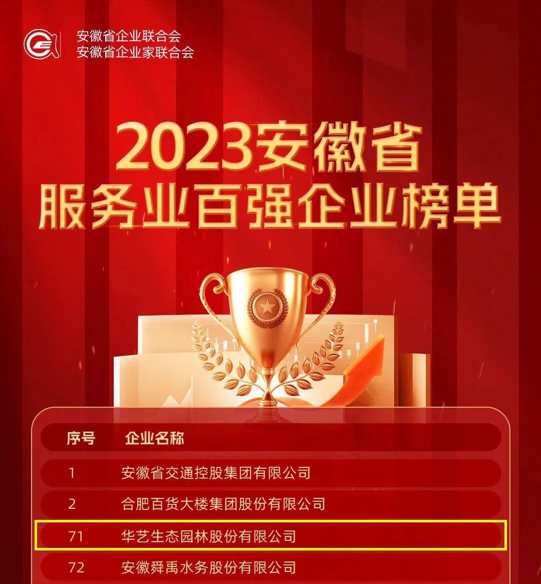 11月22日,安徽省企业联合会、安徽省企业家联合会向社会发布了2023安徽省综合百强、制造业百强、服务业百强企业榜单。华艺生态园林股份有限公司凭借强劲的综合实力、行业影响力、发展潜力以及创新力,已连续第五次成功入选安徽省服务业百强企业榜单。