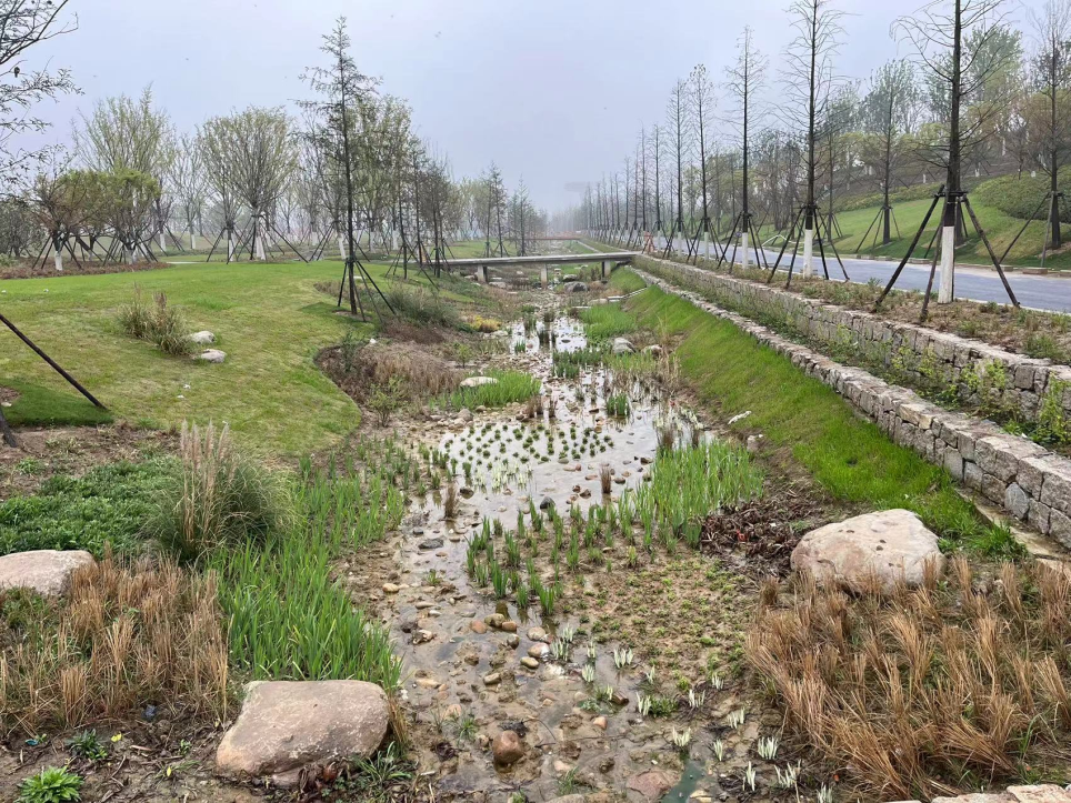 2023年4月,锦绣湖公园2标段大型植草沟、溪道,增加湿生植物、观赏草类植物、木本灌木类植物,沿线地形精细化修整,河道景石整治梳理,营造一座色彩缤纷、互动参与、生机盎然的城市公园。