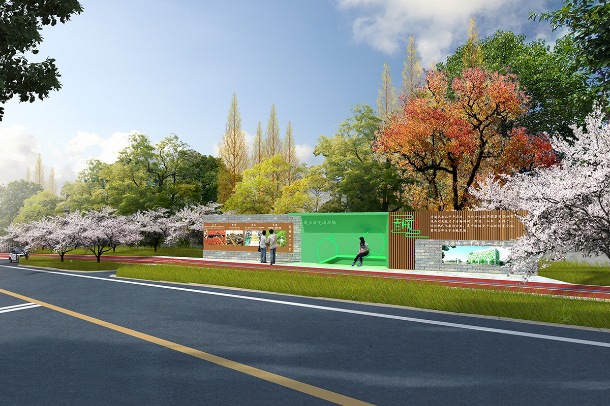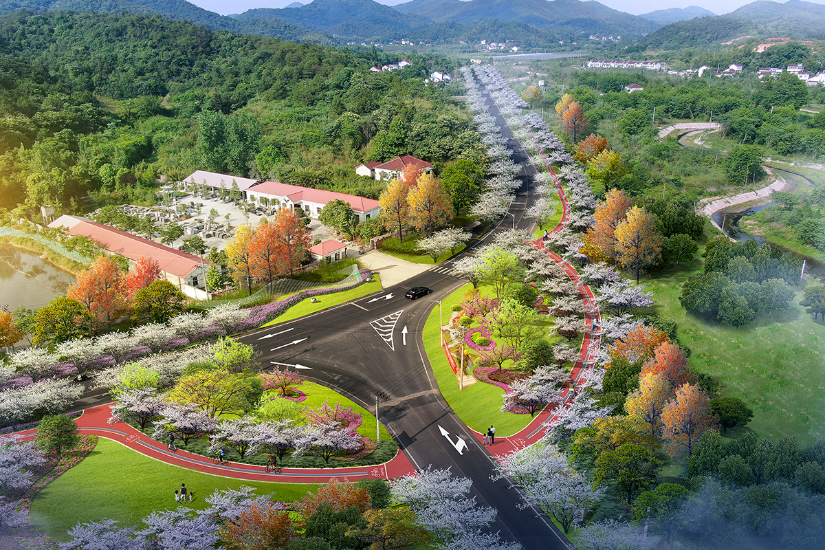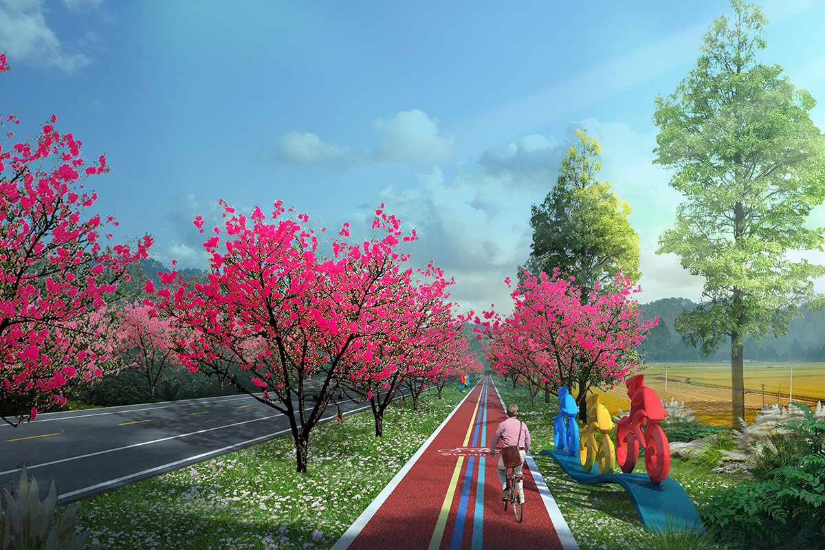 设计以健身绿道贯穿始终,并串联多个景观节点、文化节点和服务驿站。以繁昌青梅为主题元素,全段道路两侧采用青梅阵列种植,打造繁昌青梅大道特色景观,绿道外侧采用水杉和枫香间隔交错种植,地被采用自然多年生子播花草组合,体现乡野自然植物景观空间,下层植物空间主要以通透为主,满足绿道游客观赏繁昌田园风光景色。